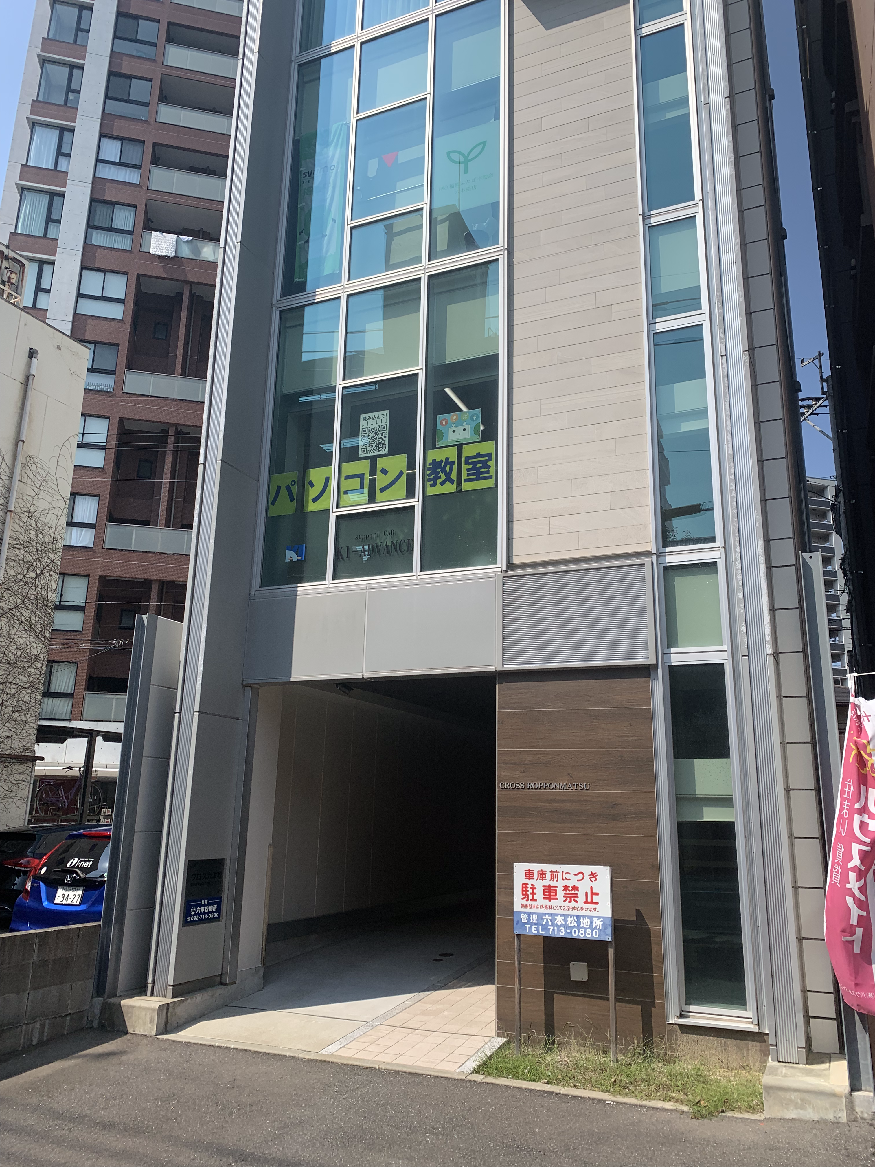 写真のビル「クロス六本松」の二階に、教室があります。二階の窓から見える『すきぱそくん』が目印です。