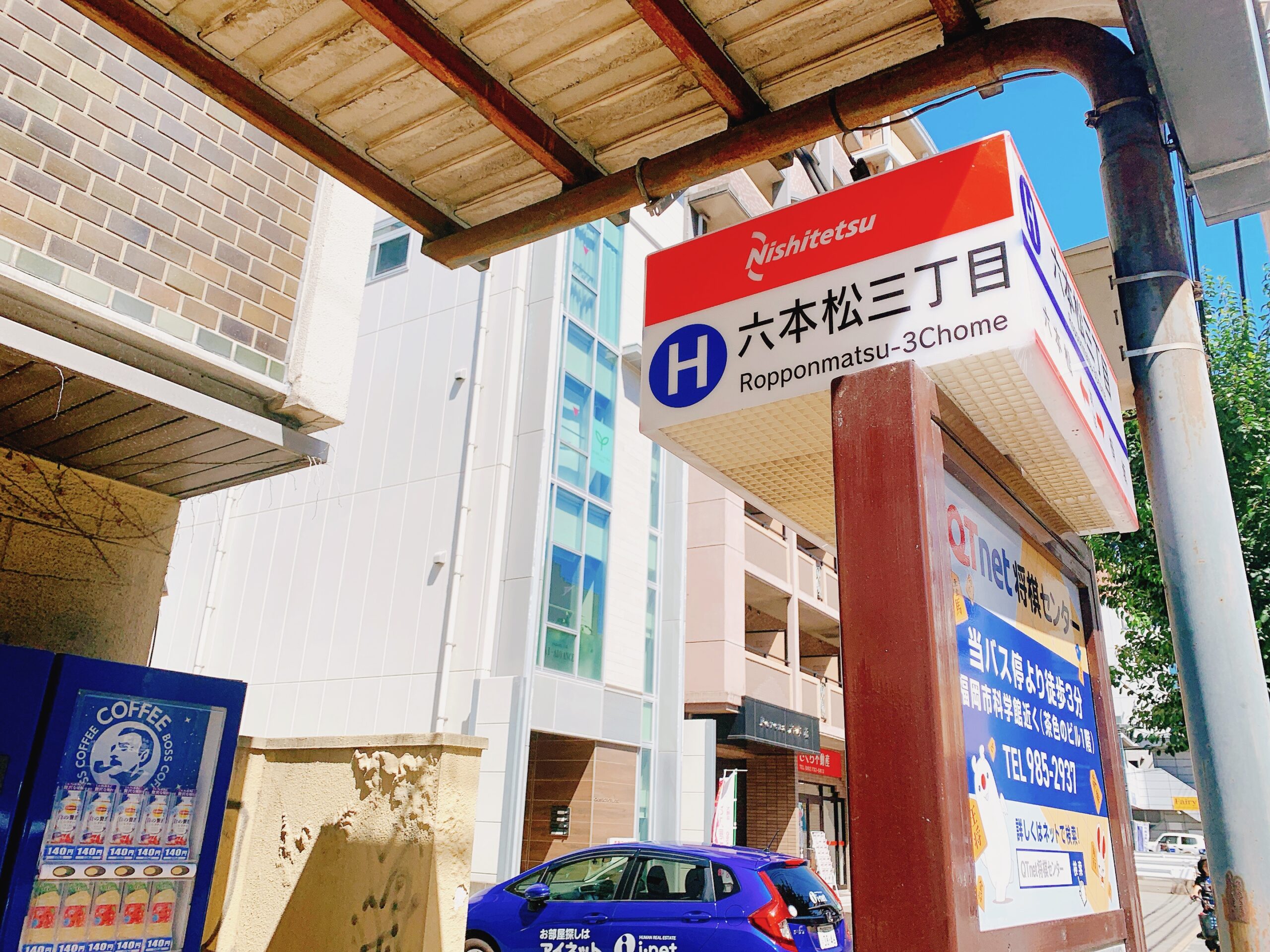 教室からバス停まで徒歩10秒と驚きの近さ(のぼり方面)。くだり方面のバス停からでも、信号を渡って徒歩1分の距離にあり、アクセスは大変良いです。西鉄バス「六本松」からでも徒歩3分ほどしかかかりません。